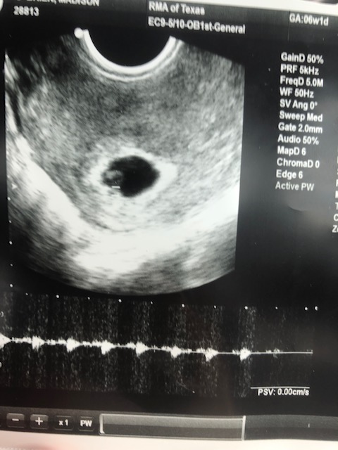 6 Weeks: We had our first ultrasound on Sept. 17th at our fertility clinic in San Antonio. We couldn’t really see much, but we did hear a heartbeat which is probably the most reassuring sound I’ve heard in my life. This was out last appointment at the clinic and we are officially graduated! The nausea has become constant although thankfully no vomiting yet. I am also beyond tired and it takes every ounce of energy to just function at work. I have begun taking a nap during lunch and a nap before rehearsals and I am still in bed by 8:00p.m.